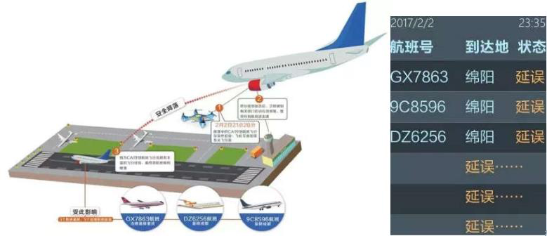 2017年 2月 2日 21點(diǎn) 26分,綿陽(yáng)機(jī)場(chǎng)塔臺(tái)收到一架正在降落航班的緊急報(bào)告,發(fā)現(xiàn)來(lái)歷不明發(fā)光飛行器。塔臺(tái)立即通知多個(gè)部門(mén)、立即啟動(dòng)了應(yīng)急預(yù)案,暫停所有航班進(jìn)出港。3個(gè)航班備降成都、重慶,5個(gè)出港航班延誤,機(jī)場(chǎng) 2 個(gè)多小時(shí)后才恢復(fù)正常起降。據(jù)綿陽(yáng)警方初步調(diào)查,懷疑是附近有人操控“黑飛”無(wú)人機(jī)。(如圖 6所示)