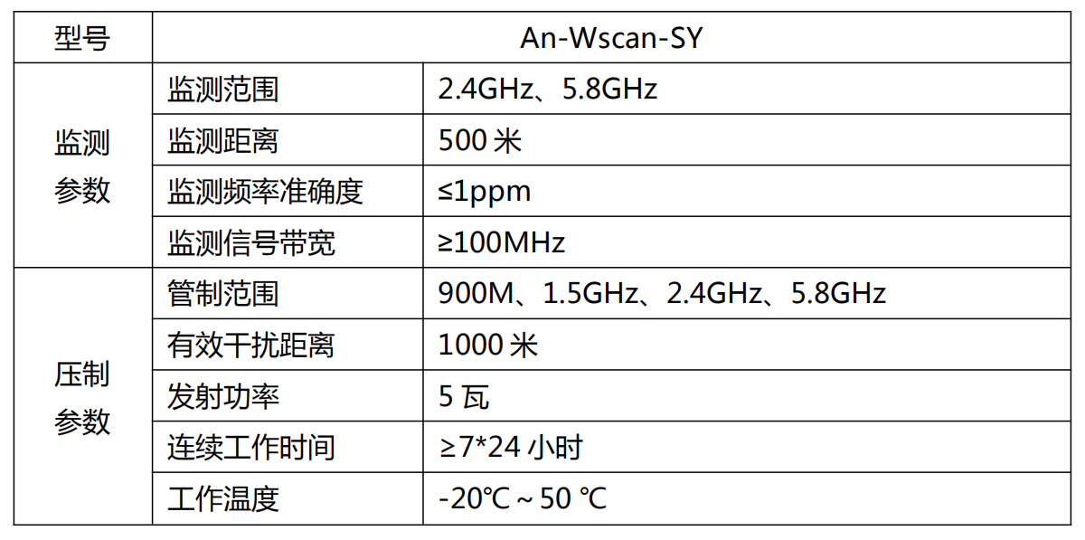 無人機無線電監測壓制一體機An-Wscan-SY是針對小型區域如別墅區、油庫、看守所、煉油廠、化工廠等小型區域開發的產品。產品可以實現在固定區域場所的工程化部署,實現自動探測,自動壓制一體化的24小時無人值守。